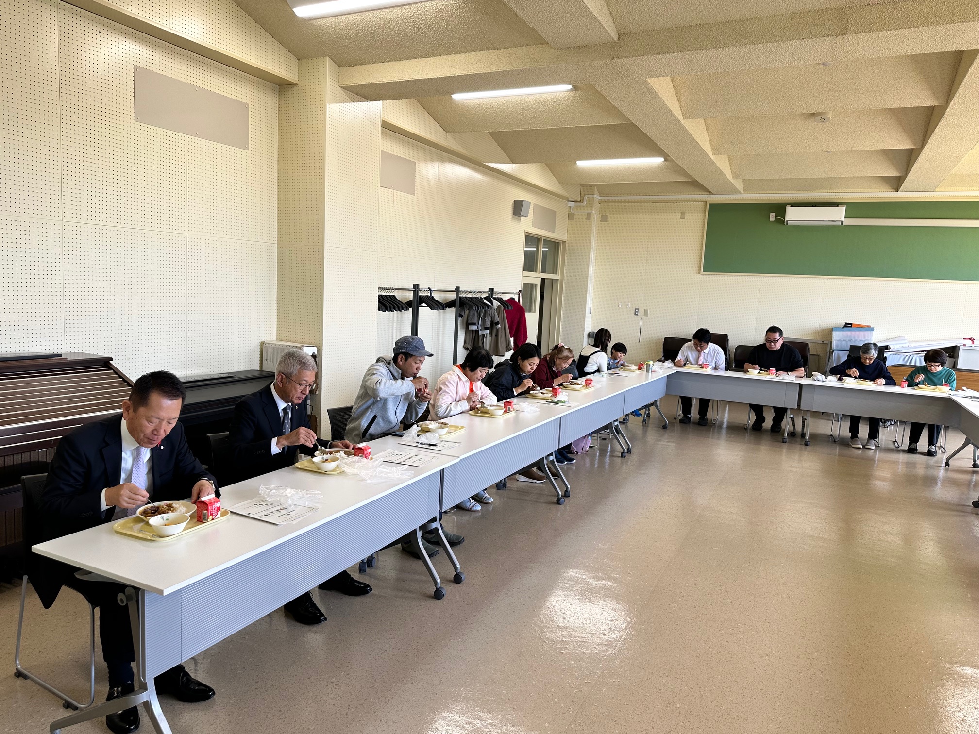 小中学生がその日に食べるポークカレーなどの給食を参加者とともに試食しました。