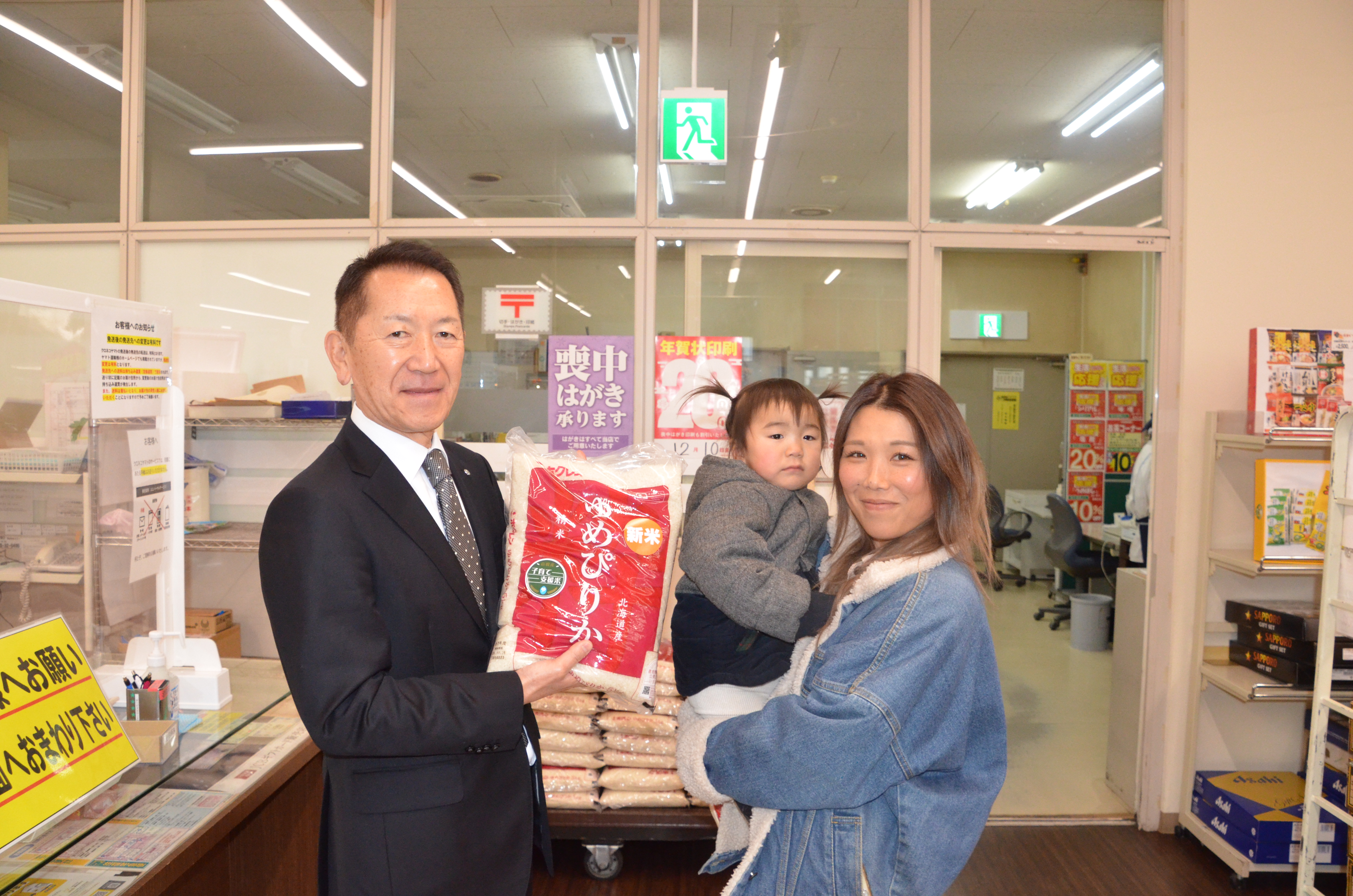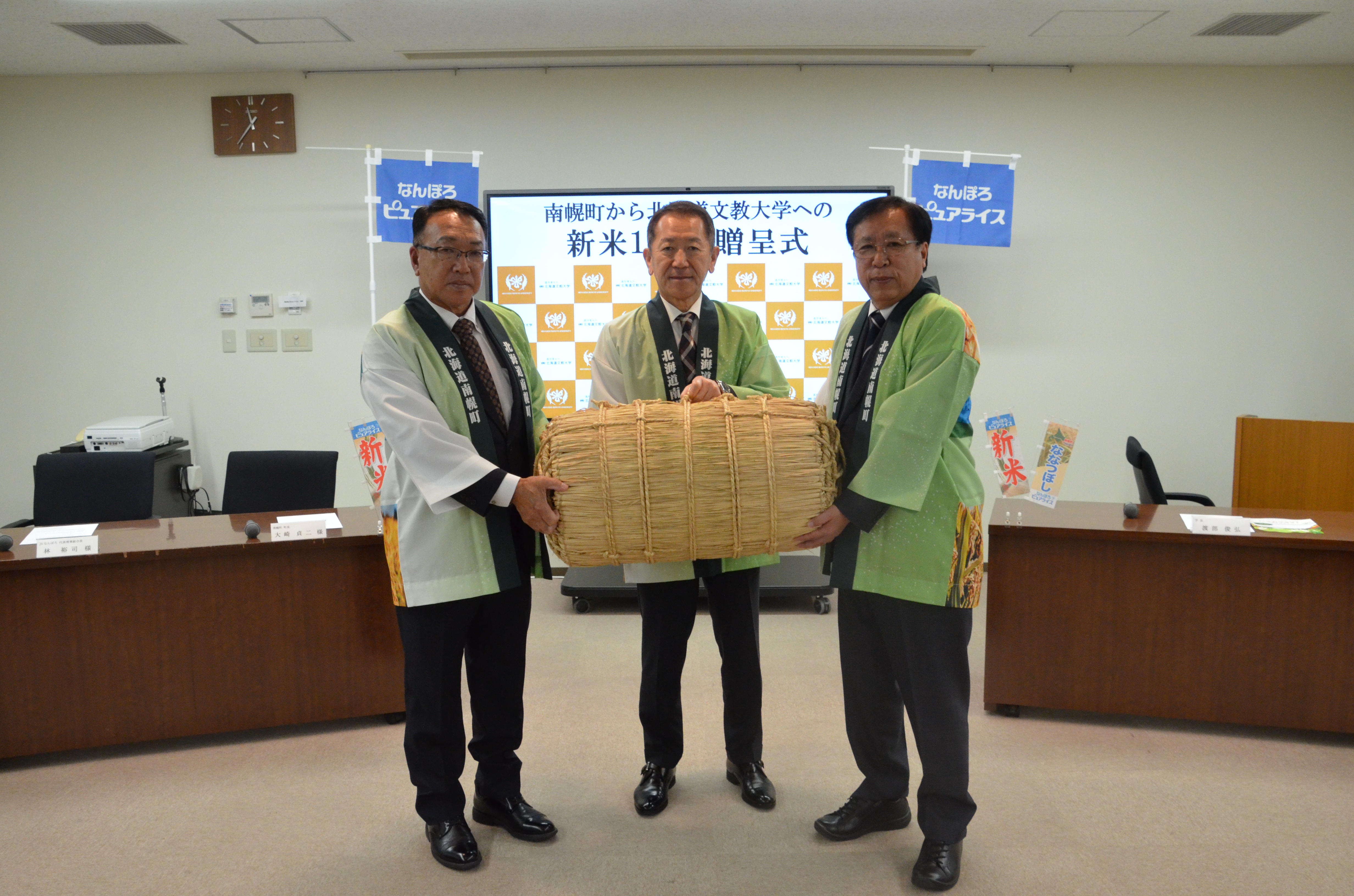 包括連携協定を締結している北海道文教大学を訪問し、新米「なんぽろピュアライスななつぼし」100㎏を贈呈しました。