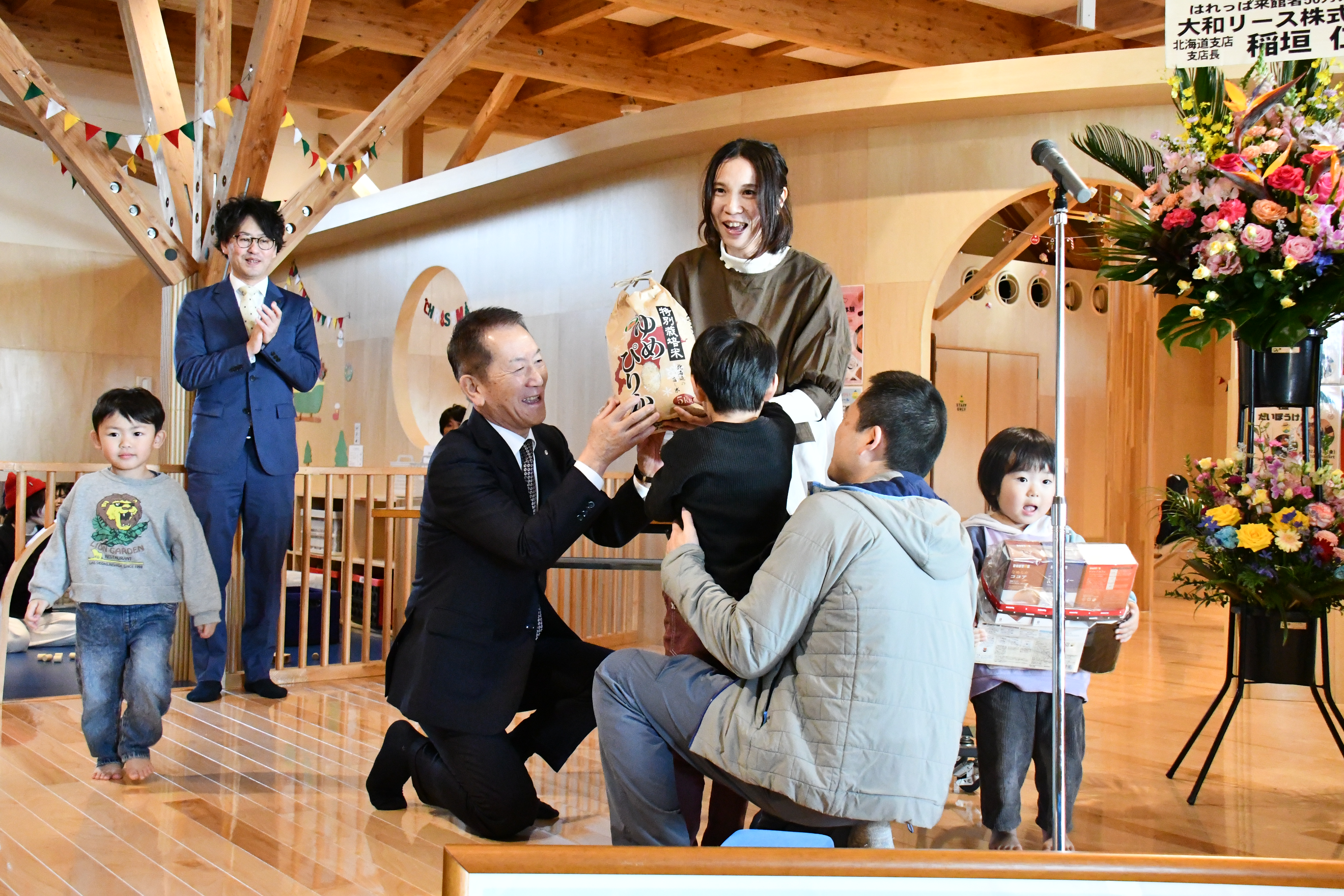 はれっぱ50万人達成セレモニーに参加し、50万人目のご家族に記念品を贈呈しました。
