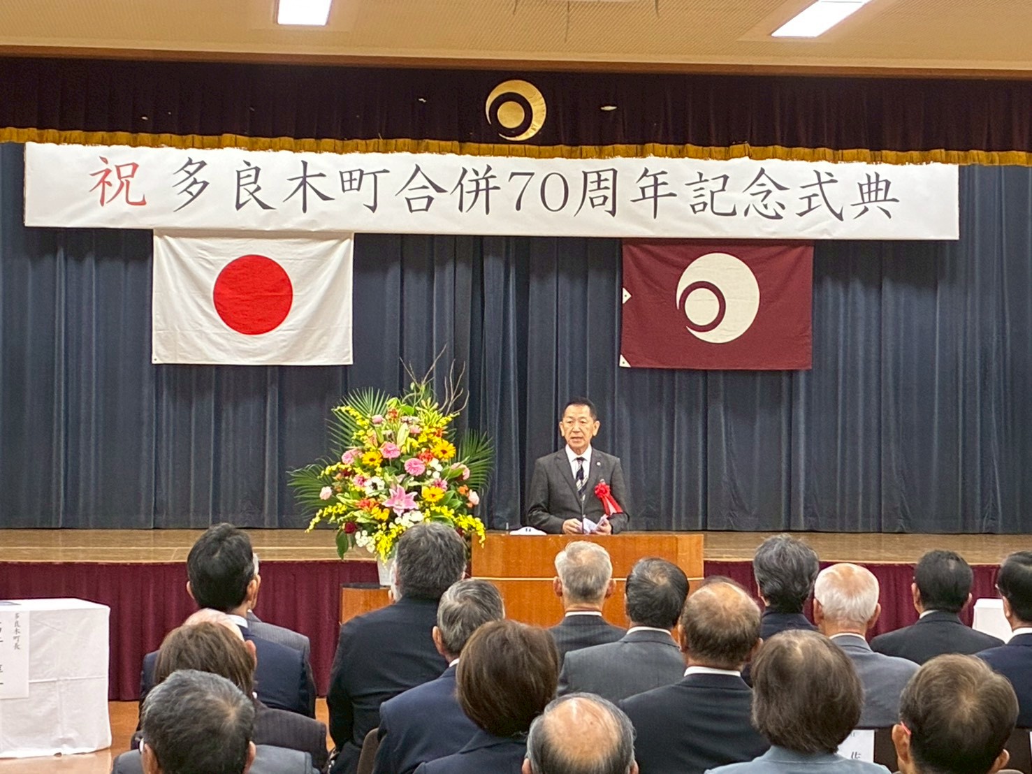 多良木町、久米村、黒肥地村が合併してから今年で70 周年を迎え、姉妹町を代表して、記念式典に出席し、お祝いの言葉を述べました。